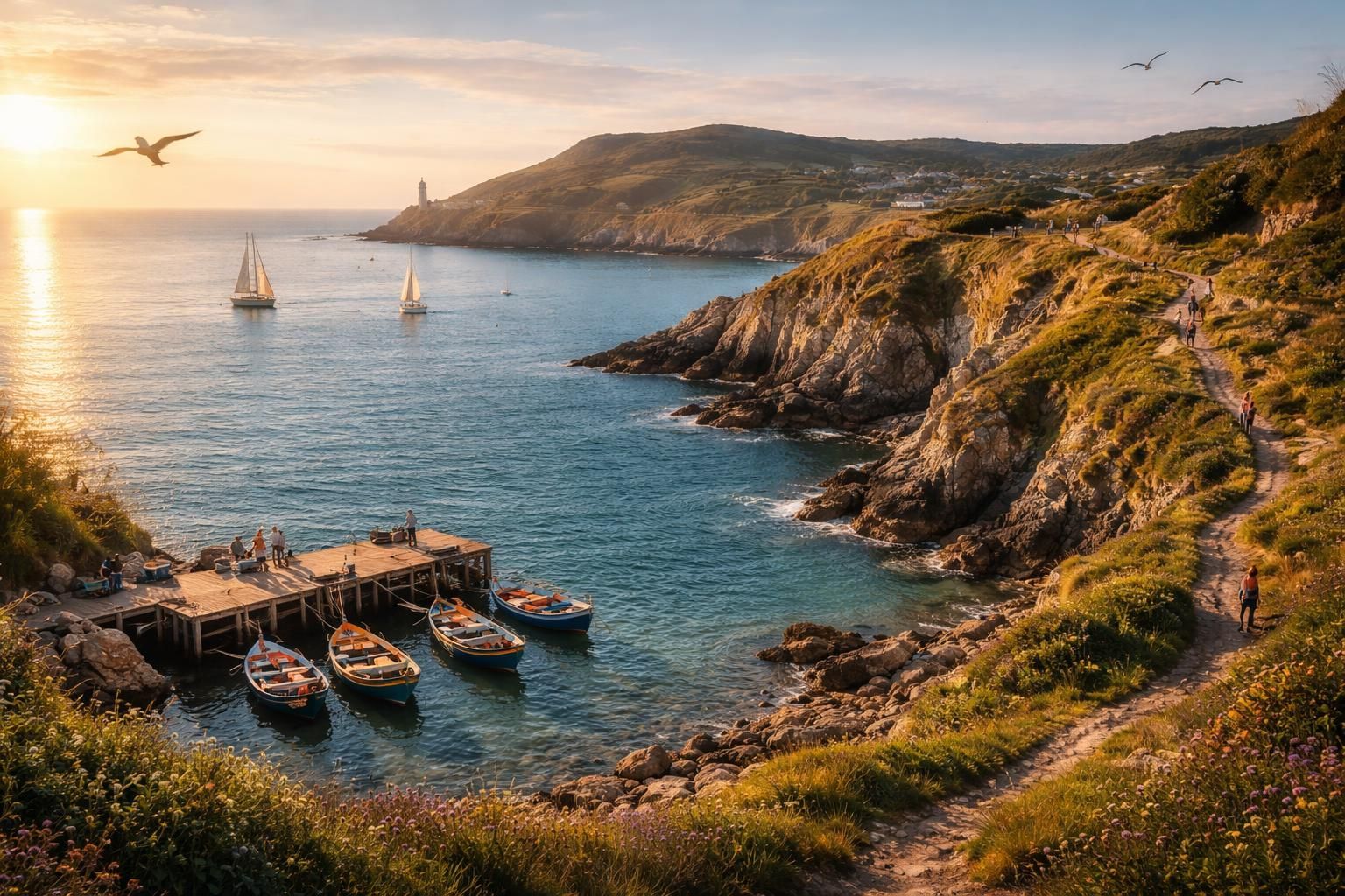 La boucle courte, d’une heure trente, relie le port au phare de Baily. Elle est adaptée aux familles et aux visiteurs souhaitant profiter d’une vue splendide sans trop se fatiguer. Cette section mêle passages en bord de falaise et haltes auprès du phare, un symbole historique de la région installé sur un promontoire d’où s’observent aussi de magnifiques couchers de soleil.